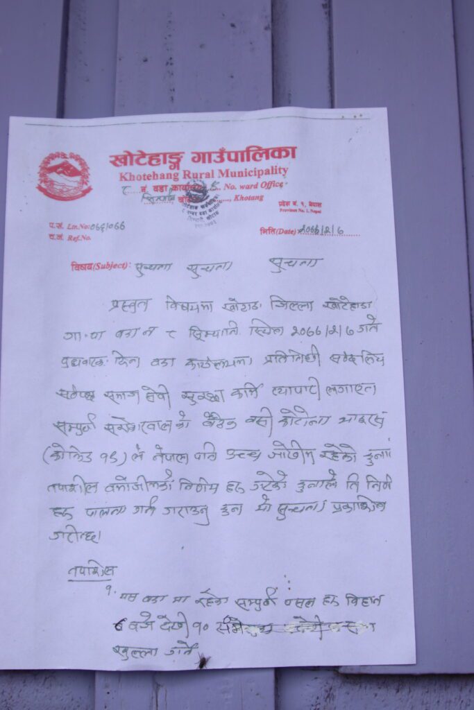 लगायतको ब्यहोरा भएको खोटेहाङ गाउँपालिका ८ नम्बर वडा कार्यालय सिम्पानीको सूचनाको तल दाहिने कुनामा हस्ताक्षर सहित भेटिए वडा सचिव दिनेश बस्नेत । जो सिम्पानी बजारमा साँझै नपरी भात खाइदिन्छन् र “मनमा आनन्द भएसी खाइन्छ हौ सर” भन्दिन्छन् ।