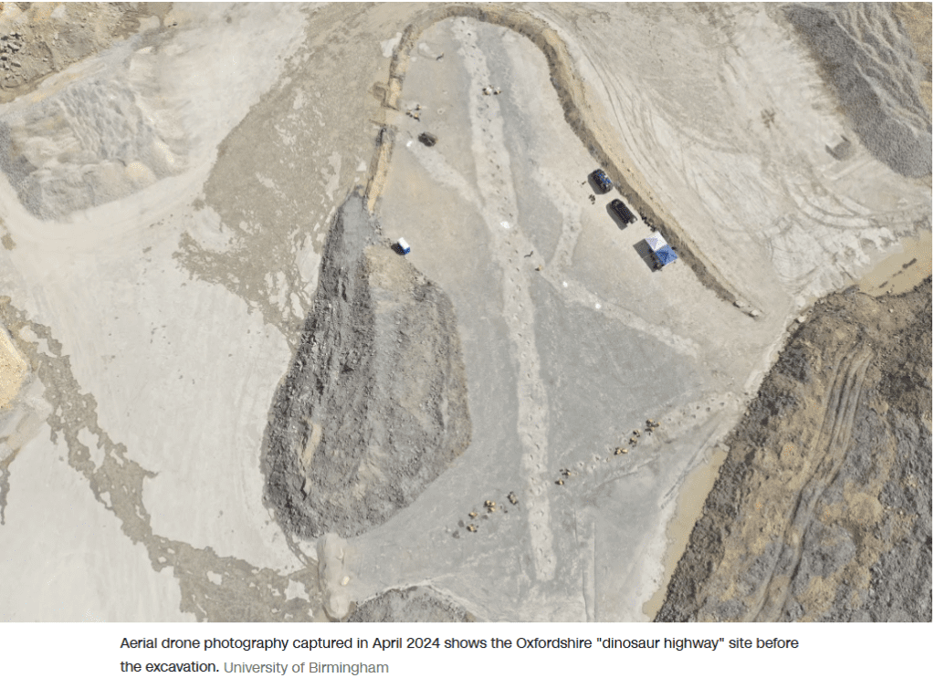 अक्सफोर्डशायरको डेवर्स फार्म खानीमा १६६ मिलियन वर्ष पुराना मध्य जुरासिक कालका करिब २०० डायनासोर पाइलाहरू फेला परेका छन्। यो असाधारण खोज सन् २०२३ मा खानी कामदार गेरी जोनसनले सडक निर्माणका लागि चून ढुङ्गा निकाल्ने क्रममा जमिनमा “अनौठा उभारहरू” महसुस गरेपछि सुरु भएको थियो।