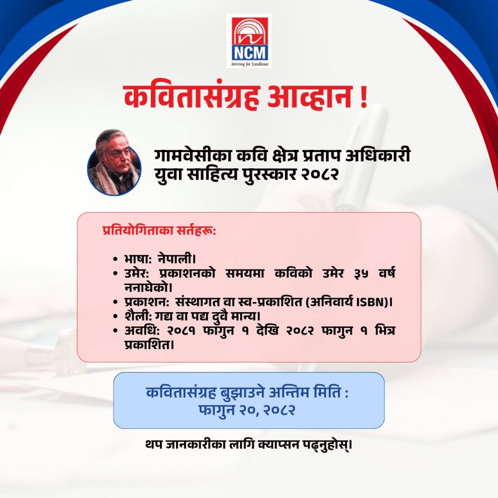 नेपाल कलेज अफ म्यानेजमेन्टको आयोजनामा हुने यस पुरस्कारका लागि इच्छुक युवा कविहरूले आफ्ना प्रकाशित कृतिहरू पठाउन सक्नेछन्।